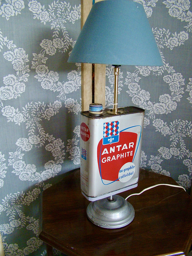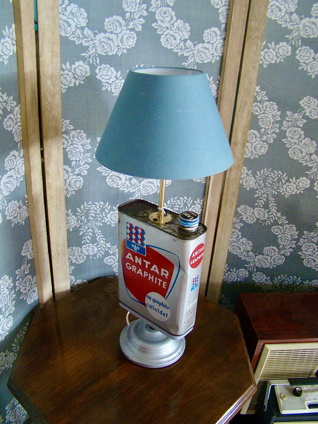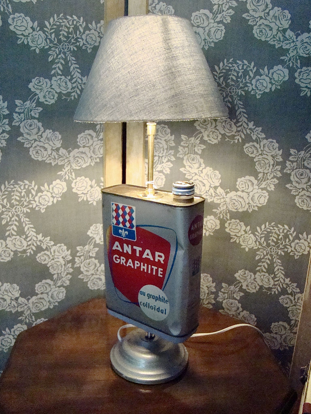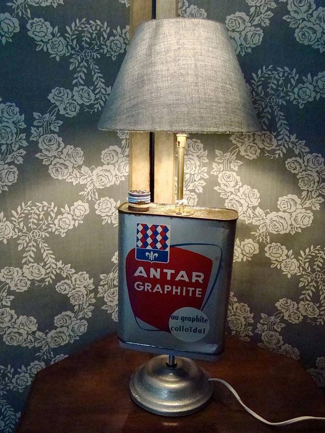 La Grey Antar est une lampe de décoration unique créée à partir d'un ancien bidon d’huile Antar, chiné dans une brocante et détourné en une lampe déco.
