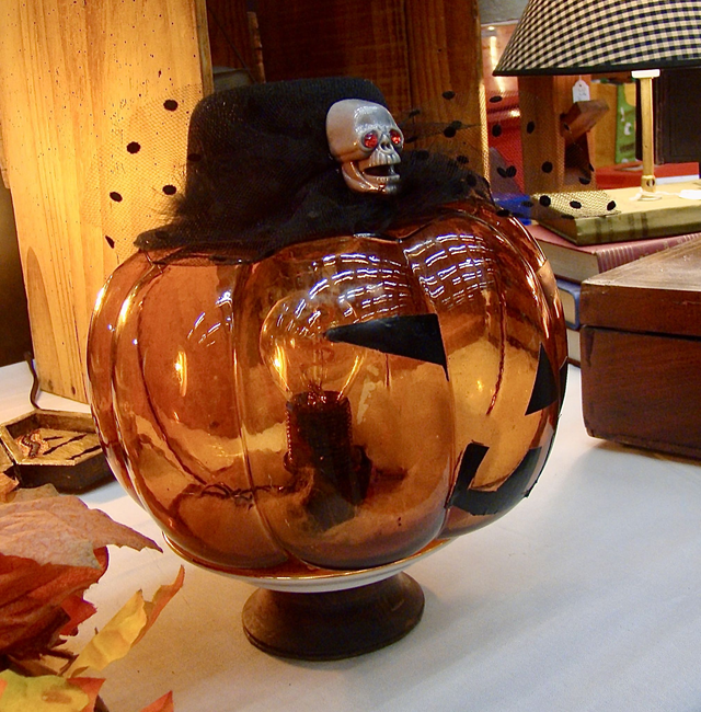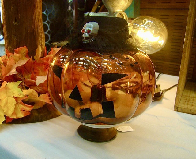Plongez dans l'esprit d'Halloween avec notre lampe citrouille d'Halloween, créée à partir d'une citrouille en verre, d'une ancienne soucoupe de tasse, de décoration d'Halloween et de bois recyclé.
