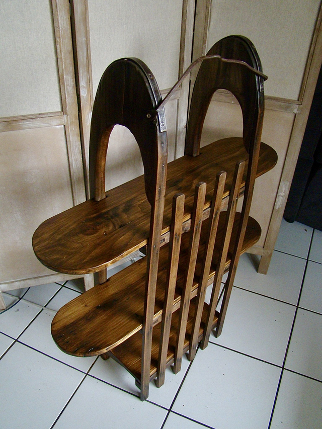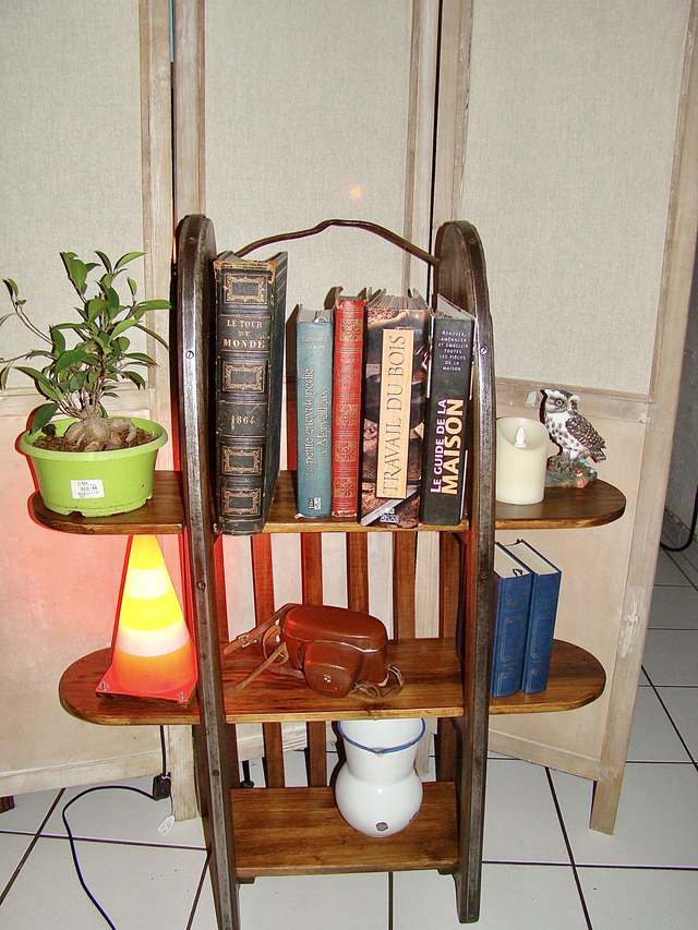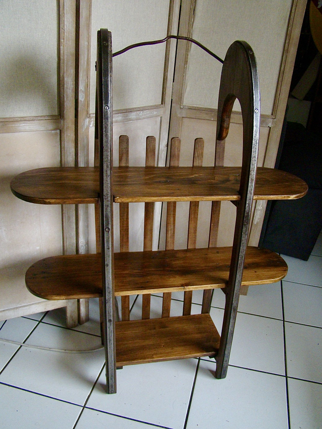 Cette pièce unique n'est pas seulement une étagère fonctionnelle mais aussi un morceau d'histoire et d'artisanat, parfait pour ajouter une touche de créativité recyclée à votre maison.