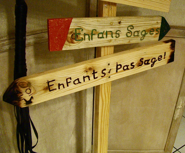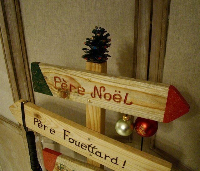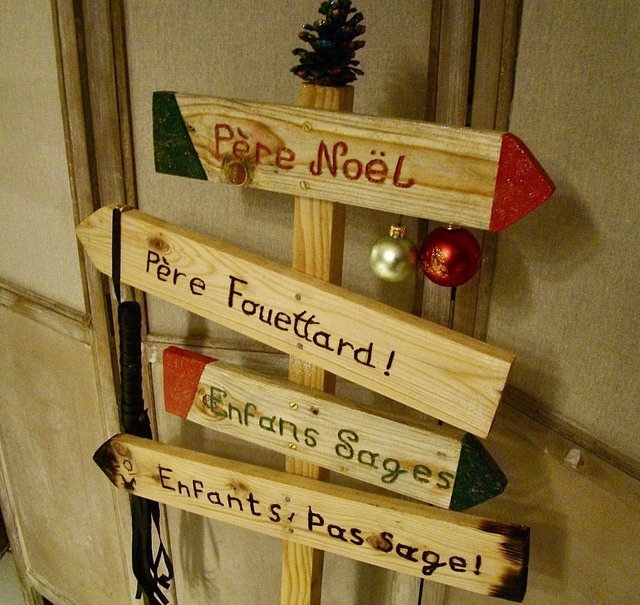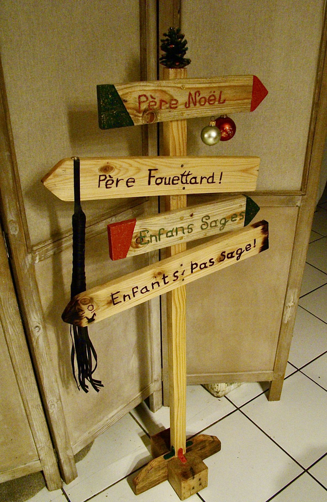 Cette pancarte indique de manière humoristique la direction du Père Noël pour les enfants sages, ainsi que celle du Père Fouettard pour les enfants moins sages. Chaque pancarte est une pièce unique, apportant une touche originale et créative à votre décor de Noël.