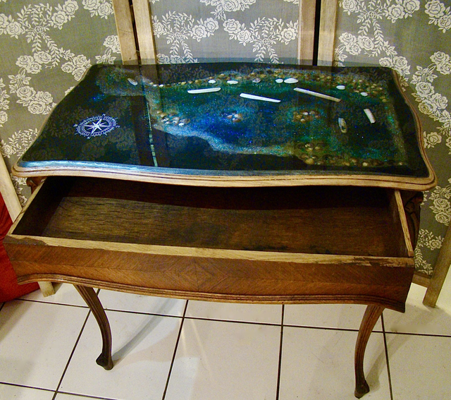 Mais entre des mains créatives, elle est devenue une pièce unique : un véritable paysage marin, une œuvre fonctionnelle qui marie le charme du vintage à la poésie de l’artisanat contemporain.