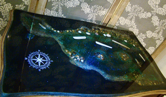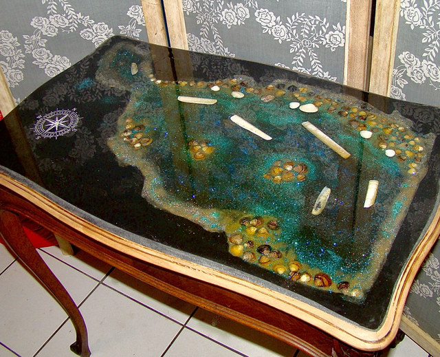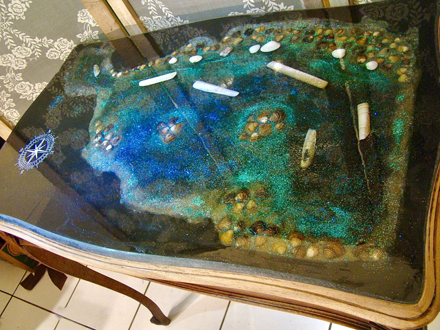 Sous une surface de résine cristalline se déploie un monde miniature : un rivage turquoise vibrant, incrusté de coquillages, de galets, d’éclats nacrés et de pigments scintillants.